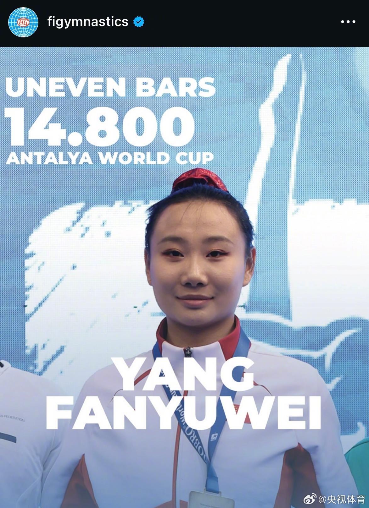 2025年国际体联体操世界杯六个分站赛的比赛全部结束。国际体联今日公布,中国体操队在两个项目中取得最高分。其中,周雅琴在科特布斯站中平衡木摘金,总分达到14.766分。杨凡予微在安塔利亚站中高低杠夺冠,总分为14.800分。
