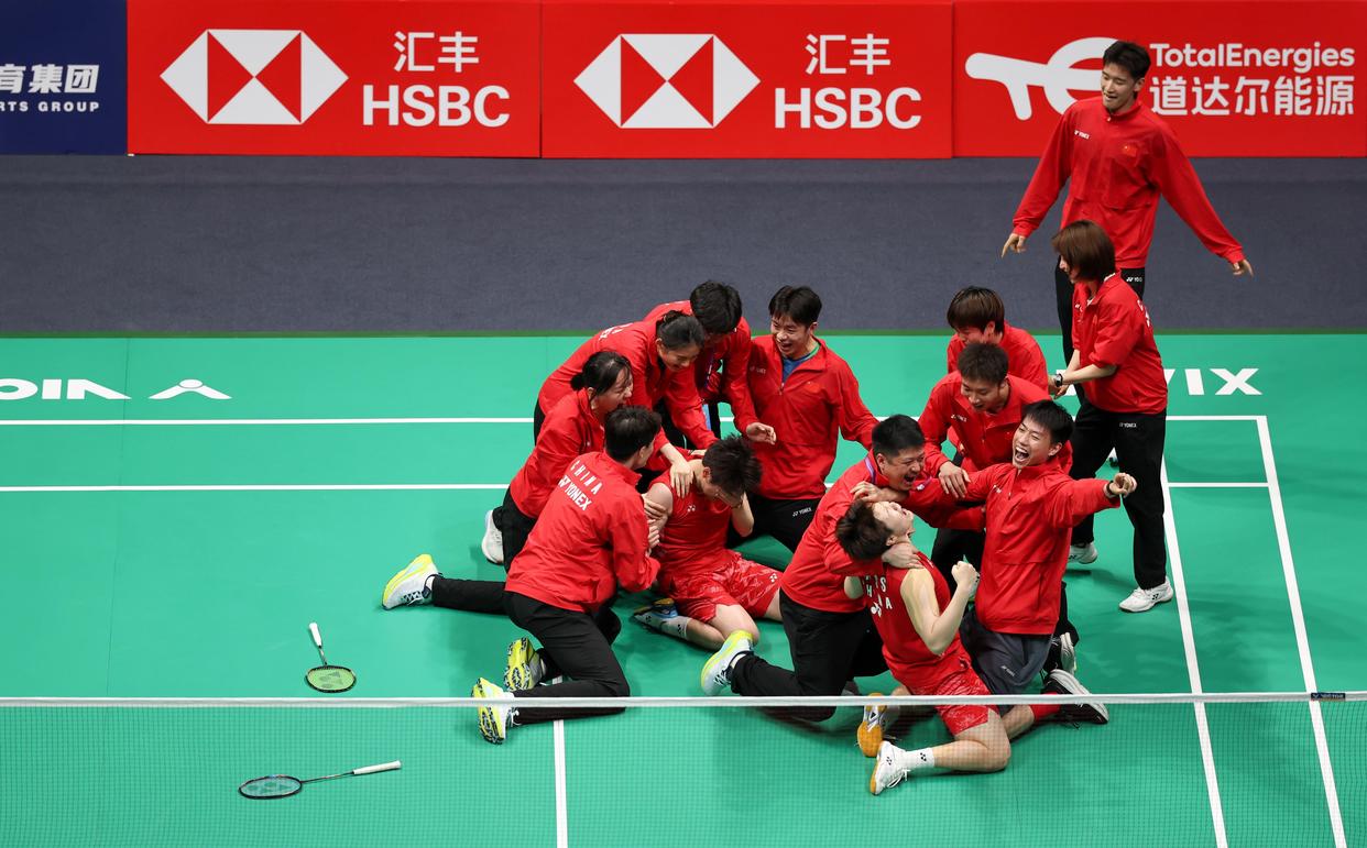 5月3日,中国队选手陈雨菲在比赛后庆祝。齐心协力,是国羽的标签