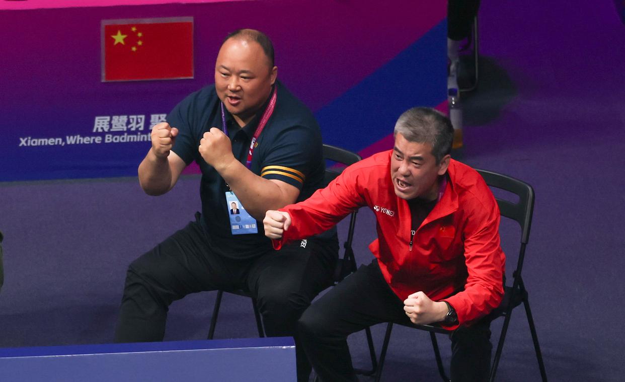 5月4日,中国羽毛球协会主席张军(左)和中国队教练杨明在为中国队加油。本届赛事