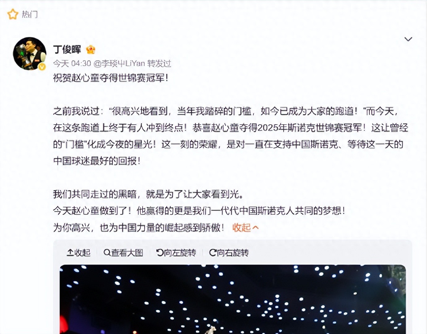 之前我说过:“很高兴地看到,当年我踏碎的门槛,如今已成为大家的跑道!”而今天,在这条跑道上终于有人冲到终点!恭喜赵心童夺得2025年斯诺克世锦赛冠军!这让曾经的“门槛”化成今夜的星光!这一刻的荣耀,是对一直在支持中国斯诺克、等待这一天的中国球迷最好的回报!我们共同走过的黑暗,就是为了让大家看到光。今天赵心童做到了!他赢得的更是我们一代代中国斯诺克人共同的梦想!为你高兴,也为中国力量的崛起感到骄傲!