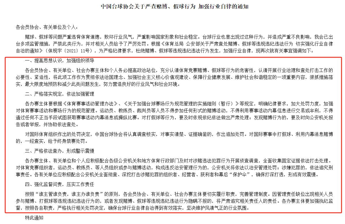 2022年1月,中国台球协会曾发布关于严查赌博、假球行为 加强行业自律的通知,其中提到将“严格落实规定,依法加强管理”,“严格依法查办,形成警示震慑”。