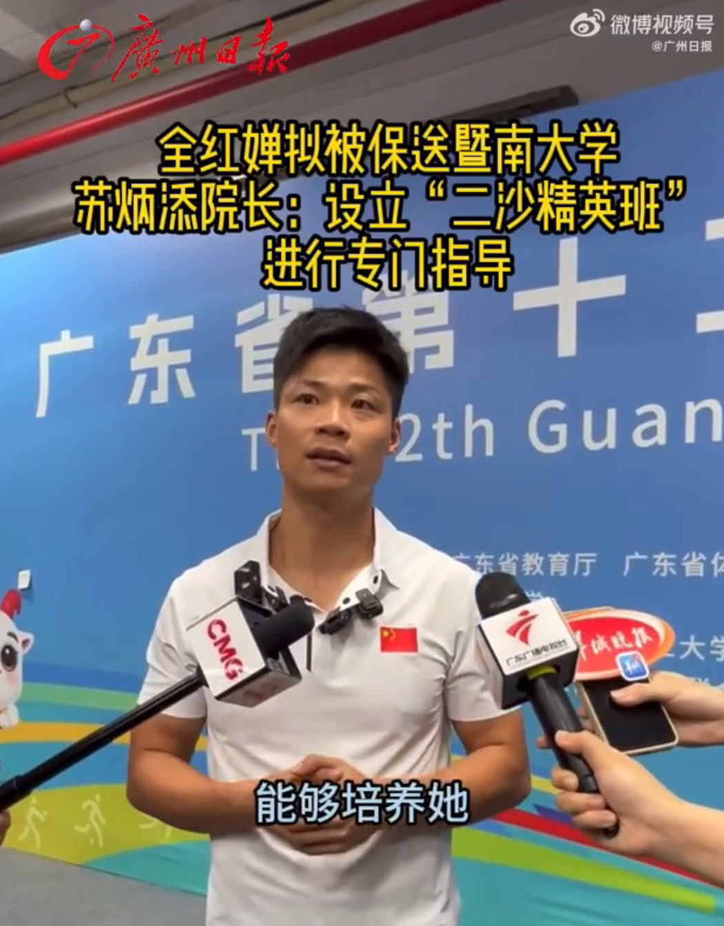 名单显示,全红婵拟被保送暨南大学。5月6日晚,亚洲飞人、暨南大学体育学院院长苏炳添在接受采访时最新透露:即将成立“二沙精英班”,对全红婵等高水平运动员进行专门的学习指导。