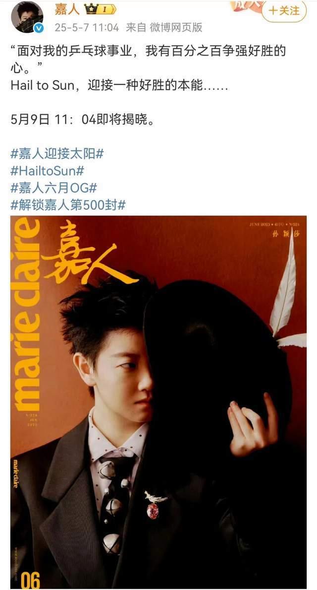 5月7日,《嘉人》杂志晒出最新一期的孙颖莎的封面照,并配文:“面对我的乒乓球事业,我有百分之百争强好胜的心。”