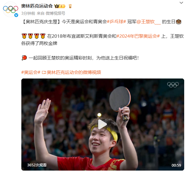 国际奥委会官微@奥林匹克运动会 发布视频,回顾王楚钦的奥运精彩时刻。