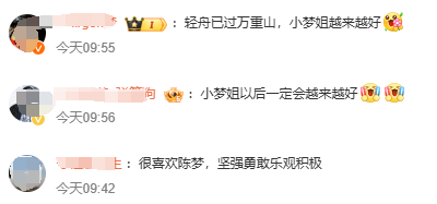 网友也纷纷表示:很喜欢陈梦的坚强勇敢、乐观积极,以后一定会越来越好。