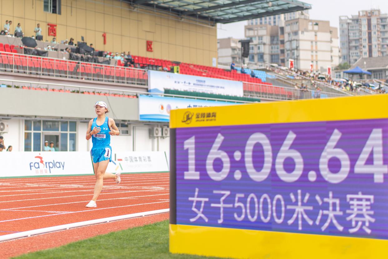 5月14日,河南队选手梁田田在决赛冲线后。最终,她以16分06秒64的成绩夺得冠军。新华社记者 黄伟 摄