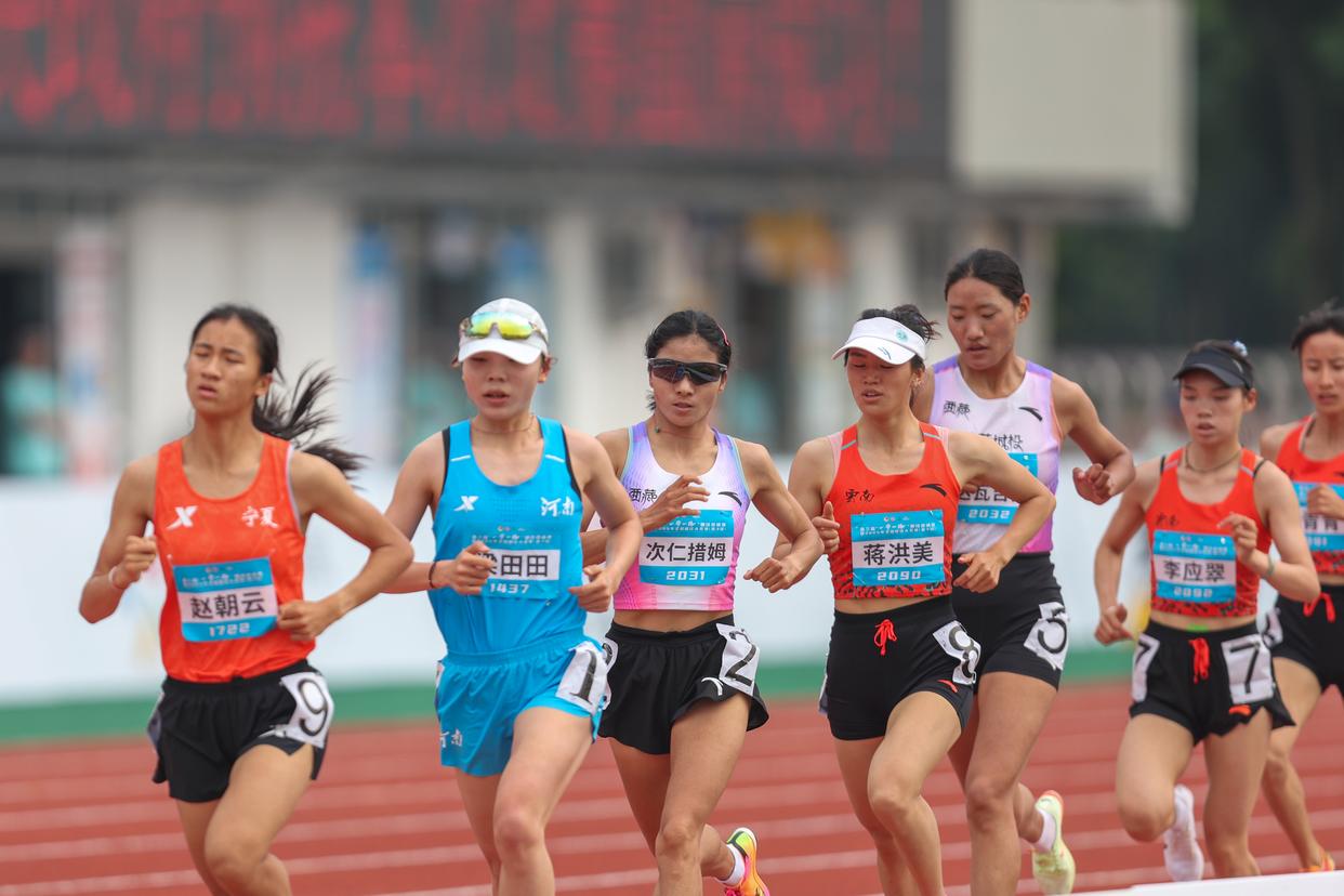 5月14日,河南队选手梁田田(左二)、西藏拉萨城投队选手次仁措姆(左三)、云南队选手蒋洪美(左四)在决赛中。最终,梁田田以16分06秒64的成绩夺得冠军。次仁措姆、蒋洪美分获亚、季军。新华社记者 黄伟 摄