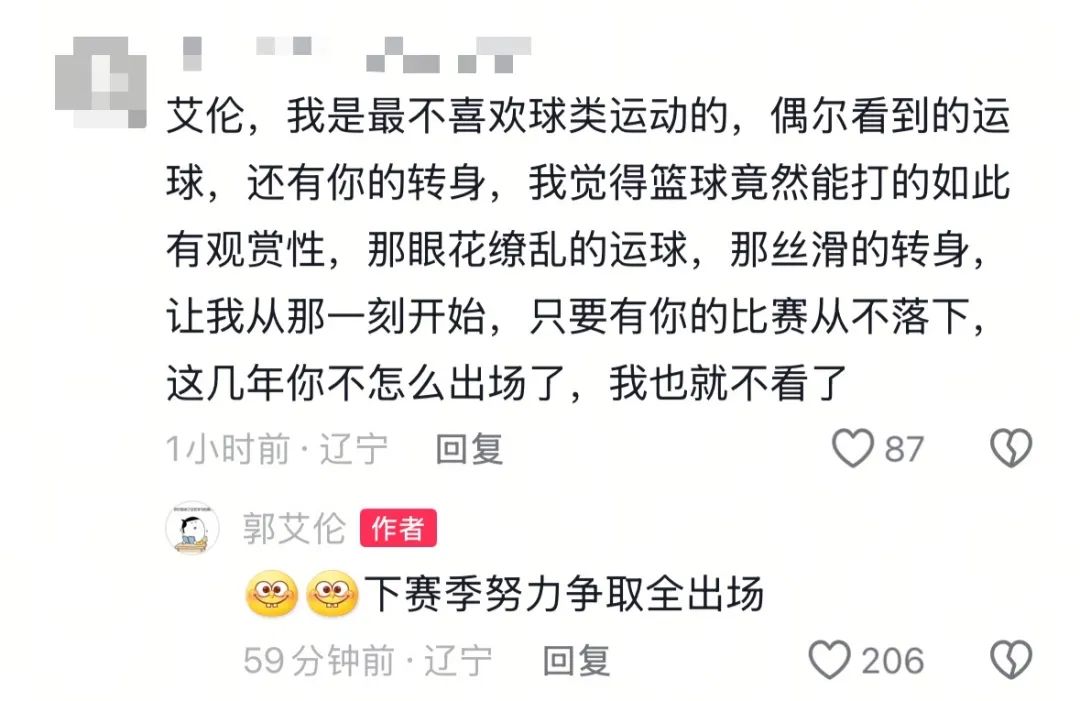 郭艾伦还在评论区回复了期待自己上场的球迷:“下赛季努力争取全出场!”