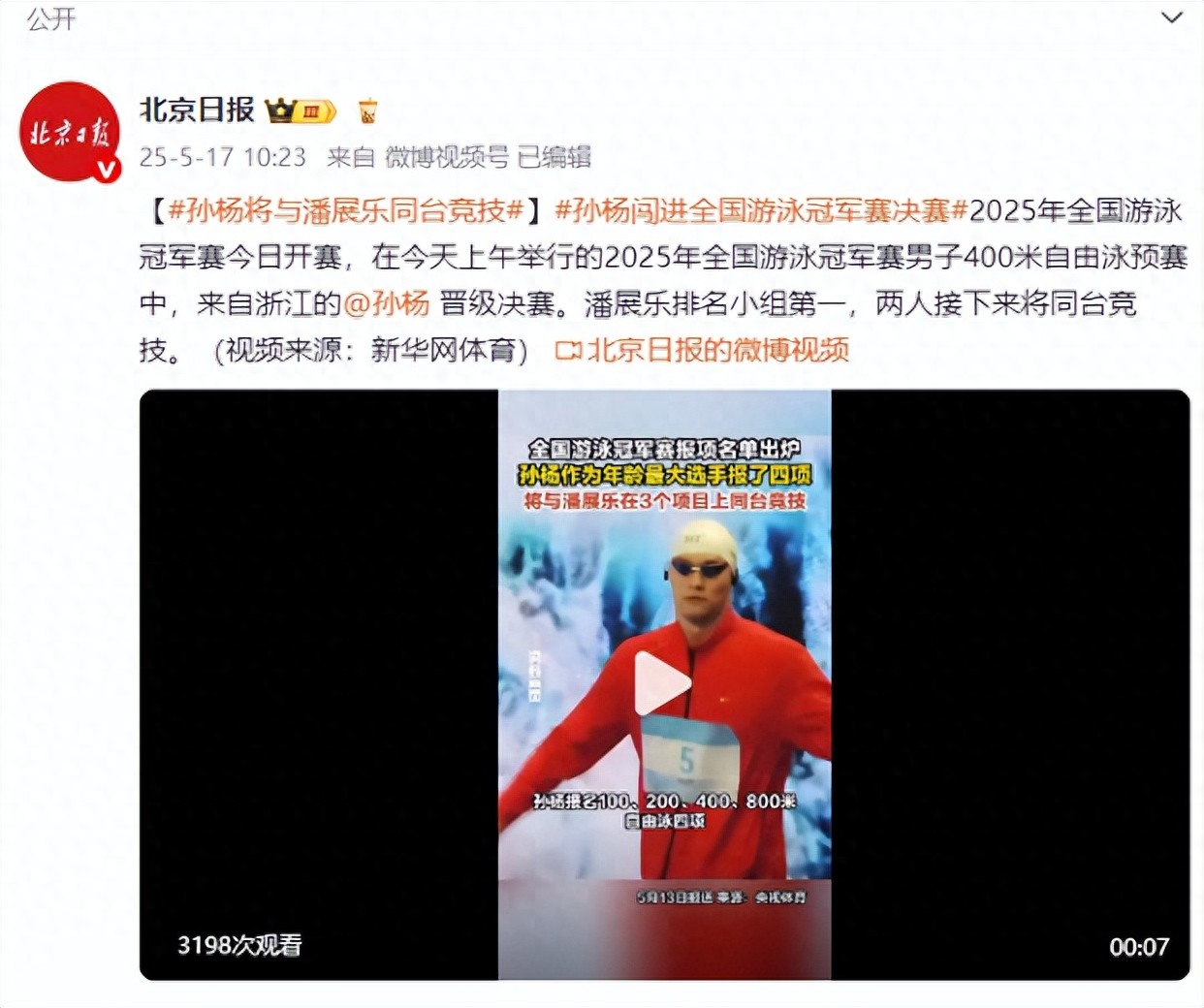 2025年全国游泳冠军赛今日开赛,在今天上午举行的2025年全国游泳冠军赛男子400米自由泳预赛中,来自浙江的@孙杨晋级决赛。潘展乐排名小组第一,两人接下来将同台竞技。