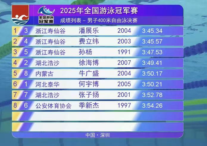 5月17日晚,2025年全国游泳冠军赛男子400米自由泳决赛在深圳大运中心游泳馆举行。潘展乐以3分45秒34的成绩夺冠,费立纬以3分45秒57夺得亚军,孙杨则以3分47秒53的成绩获得季军。