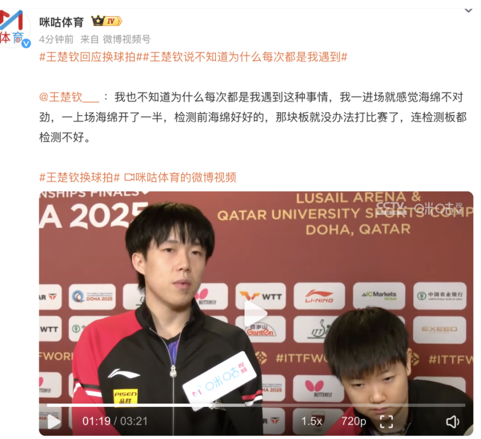 对此,王楚钦发声:“我也不知道为什么每次都是我遇到这种事情,我一进场就感觉海绵不对劲,一上场海绵开了一半,检测前海绵好好的,那块板就没办法打比赛了,连检测板都检测不好。”