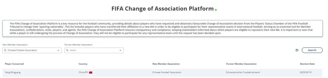 5月20日,国际足联协会变更平台官网显示,成都蓉城中场杨明洋的会籍由瑞士足协变更成中国足协,这也就意味他已经具备代表国足出战6月份两场18强赛的资格。