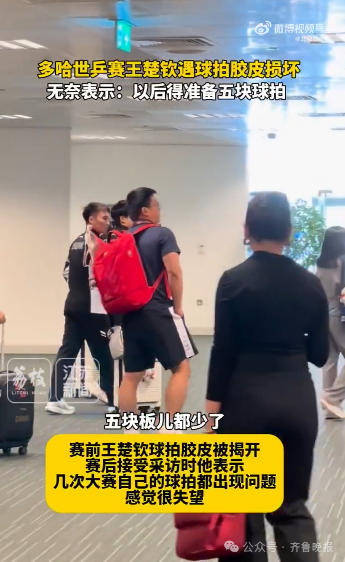 5月19日下午,2025年国际乒联多哈世界乒乓球锦标赛混双1/16决赛中,中国选手王楚钦的球拍在赛前检测环节出现受损情况。