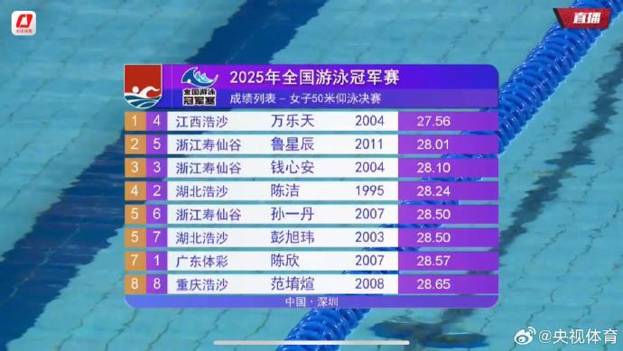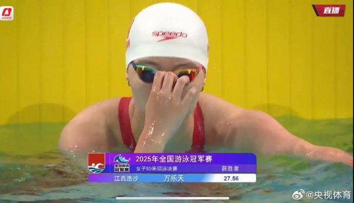 2025年全国游泳冠军赛女子50米仰泳决赛中,万乐天以27秒56的成绩获得金牌。