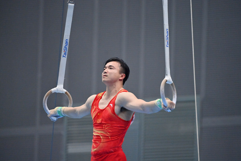 男子吊环决赛精彩纷呈。首先出场的广西队运动员兰星宇凭借出色的发挥得到14.466分。江苏队老将尤浩依旧稳健,落地干净漂亮,以14.733分实现超越。