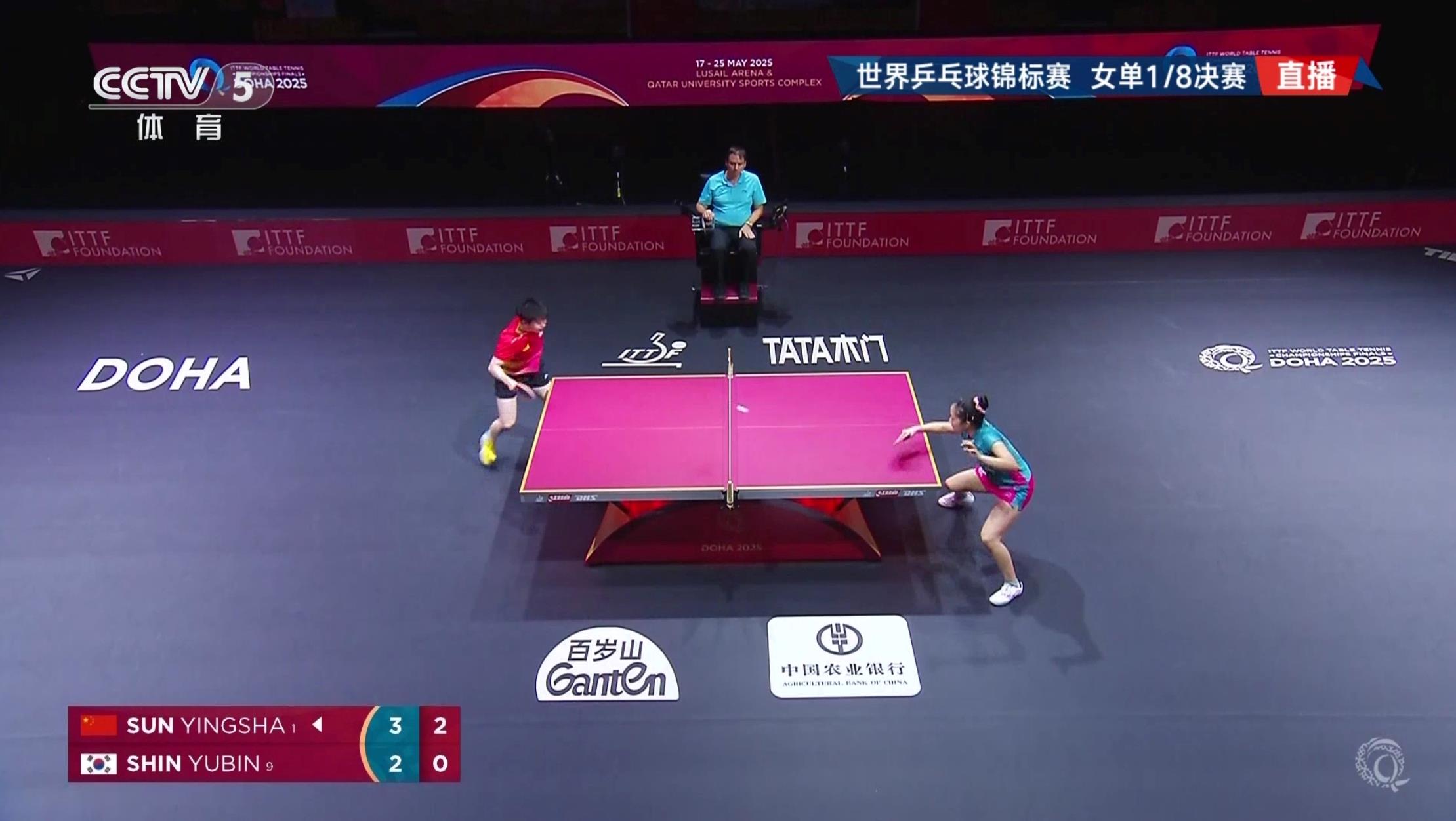 2025年多哈世乒赛女单1/8决赛,孙颖莎战胜韩国选手申裕斌,晋级八强。继续加油!