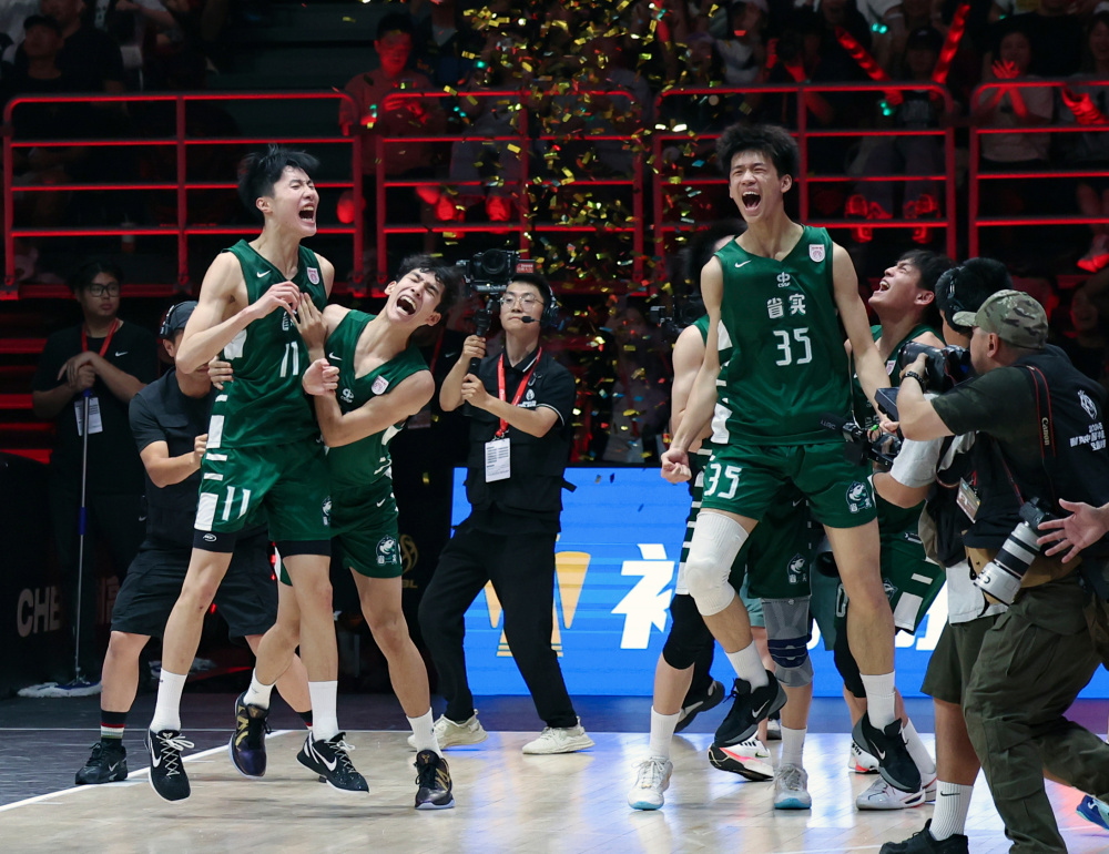 5月25日,广东实验中学队球员庆祝夺冠。新华社记者 雒圆 摄