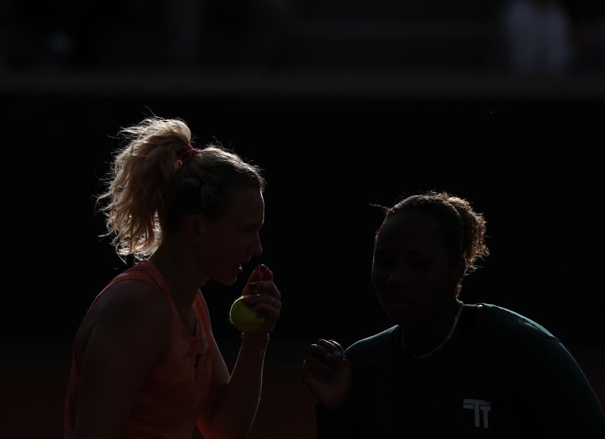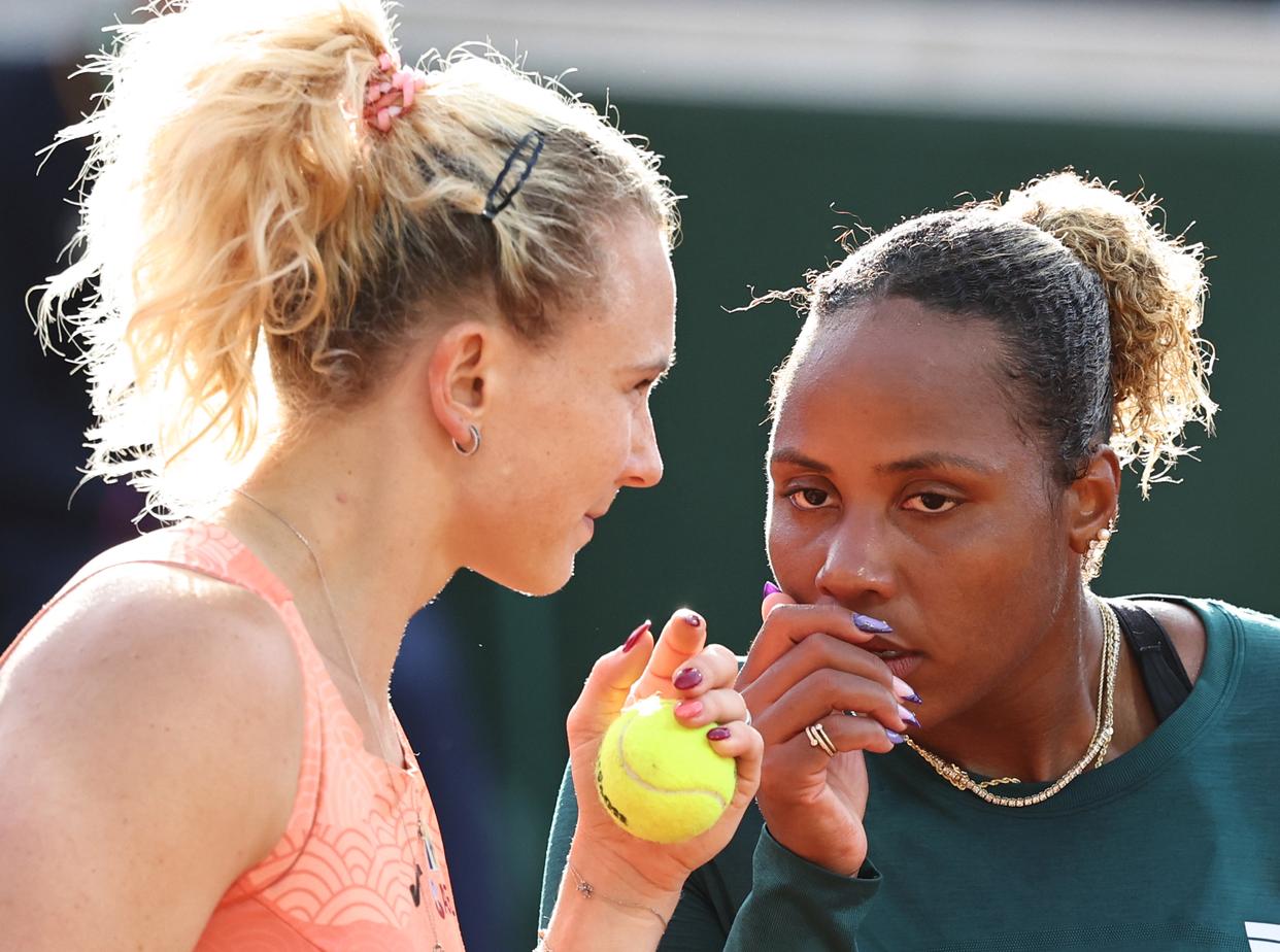 5月28日,西尼亚科娃(左)/汤森在比赛中交流。新华社记者 李京 摄