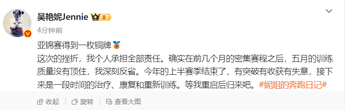 亚锦赛得到一枚铜牌,这次的挫折,我个人承担全部责任。确实在前几个月的密集赛程之后,五月的训练质量没有顶住,我深刻反省。今年的上半赛季结束了,有突破有收获有失意,接下来是一段时间的治疗、康复和重新训练。等我重启后归来吧。