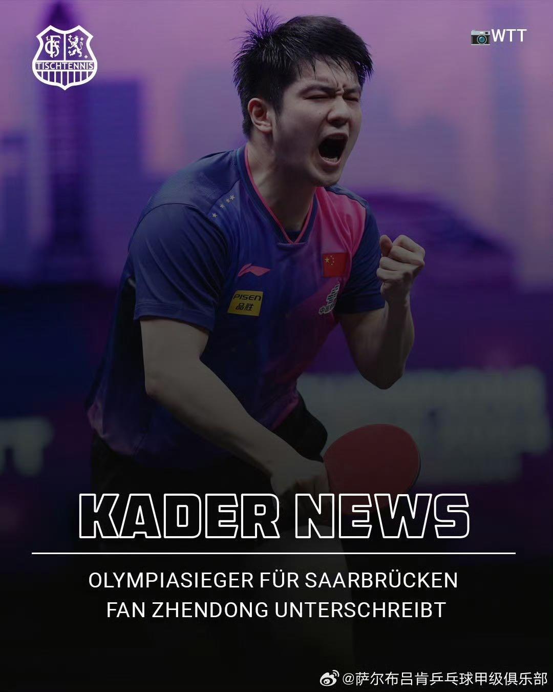 北京时间6月1日,德甲联赛萨尔布吕肯乒乓球甲级俱乐部在社交平台宣布,奥运冠军樊振东加盟,将在新赛季跟随俱乐部征战德甲。