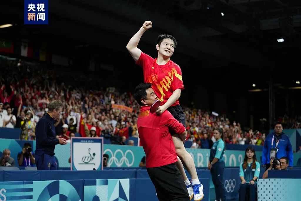 北京时间2024年8月4日,在巴黎奥运会乒乓球男子单打金牌赛中,中国选手樊振东战胜瑞典选手,夺得金牌。赛后,在场边的教练王皓将樊振东高高举起,师徒二人一起享受夺金后的喜悦。