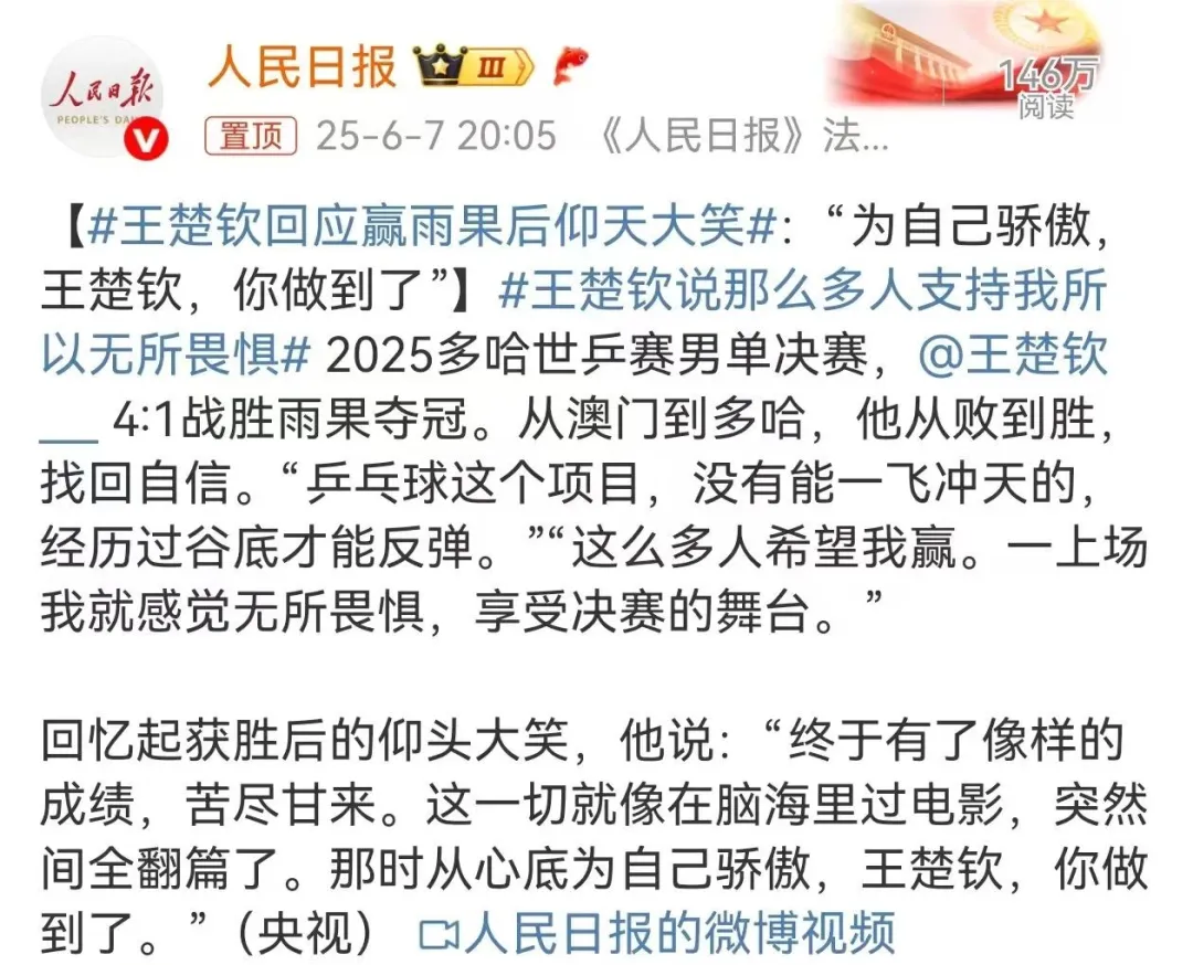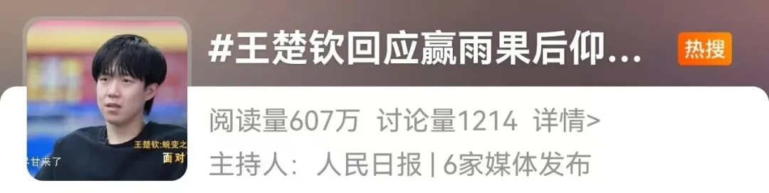 6月7日晚,“王楚钦回应赢雨过后仰天大笑”的词条,冲上热搜。