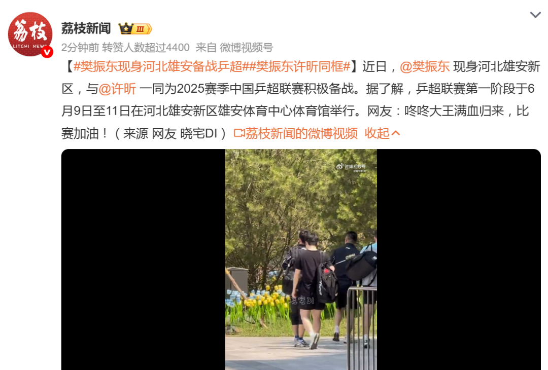 6月8日,据荔枝新闻,近日,樊振东现身河北雄安新区,与许昕一同为2025赛季中国乒超联赛积极备战。