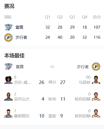 6月12日,总决赛第三场在印第安纳波利斯举行,印第安纳步行者队主场以116比107击败俄克拉荷马城雷霆队,系列赛总比分以2比1领先。
