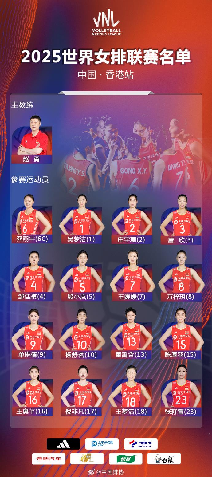 6月17日,中国排协公布了2025世界女排联赛中国香港站中国女排16人名单,与北京站的18人名单相比,少了接应范泊宁和自由人郑欣怡两人。具体名单如下: