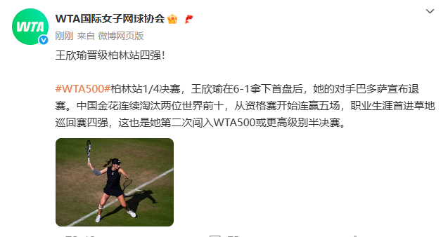 另据WTA国际女子网球协会消息,#WTA500#柏林站1/4决赛,王欣瑜在6-1拿下首盘后,她的对手巴多萨宣布退赛。中国金花连续淘汰两位世界前十,从资格赛开始连赢五场,职业生涯首进草地巡回赛四强,这也是她第二次闯入WTA500或更高级别半决赛。