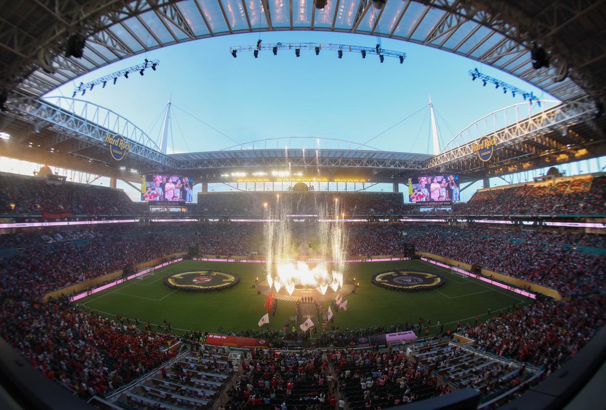 这是6月14日拍摄的世俱杯揭幕战入场仪式现场。新华社记者 徐子鉴 摄 国际足联公布的注册名单中还显示,有26人曾经夺得世界杯冠军,有来自22个国家(地区)的36名注册球员此前从未参加过世界杯。