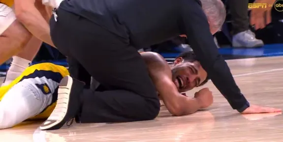 在昨日步行者与雷霆的总决赛G7首节中,哈利伯顿在蹬地启动后受伤倒地,他本人倒地后痛苦地拍打地板,随后哈利伯顿在搀扶下回到更衣室,步行者官方则宣布哈利伯顿右小腿受伤退出了这场比赛。