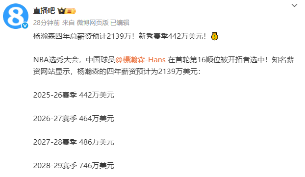 据@直播吧 消息,知名薪资网站显示,杨瀚森的四年薪资预计为2139万美元: