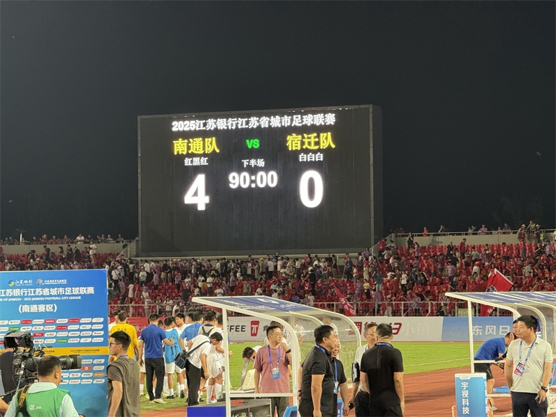 央广网南通6月29日消息(记者庄滨滨 杨梦奎)6月29日,2025江苏省城市足球联赛第五轮,南通队主场迎战宿迁队。被网友调侃为“能文能武”的南通队上演进球大战,最终4:0战胜宿迁队。因第四轮轮空,南通队升至积分榜次席,盐城队暂居榜首。