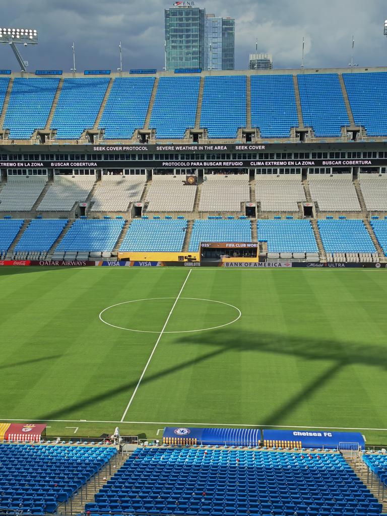 此时,空无一人的夏洛特美国银行球场艳阳高照,从球场高处远眺,记者能看到乌云正在临近。