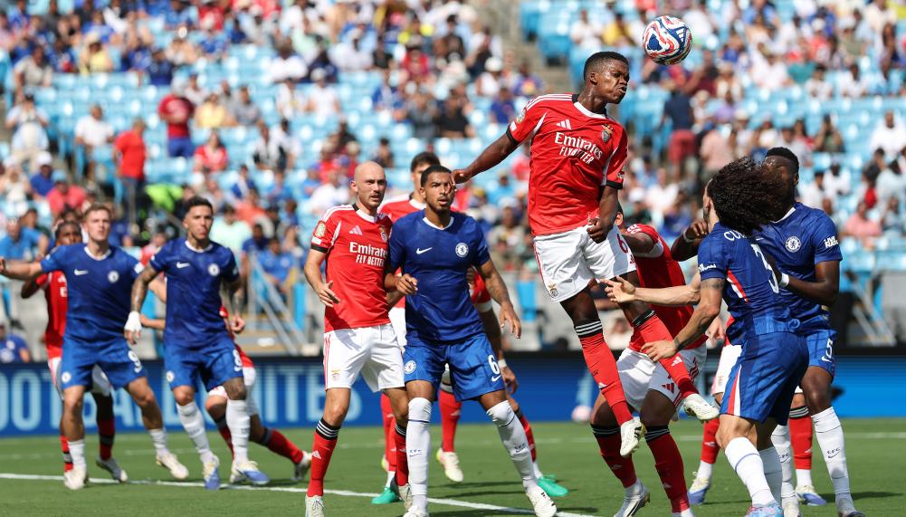 6月28日,本菲卡队球员弗洛伦蒂诺·路易斯(上)在比赛中头球解围。新华社记者 李明 摄