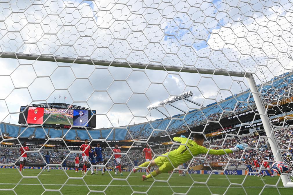 6月28日,本菲卡队门将特鲁宾(前)未能扑出切尔西队进球。新华社记者 黄宗治 摄