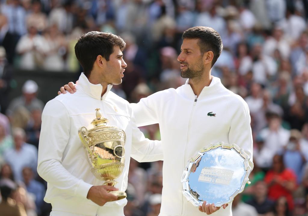 焦科维奇与阿尔卡拉斯(左)在2024温布尔登网球公开赛男单颁奖仪式上交流 新华社记者 李颖 摄