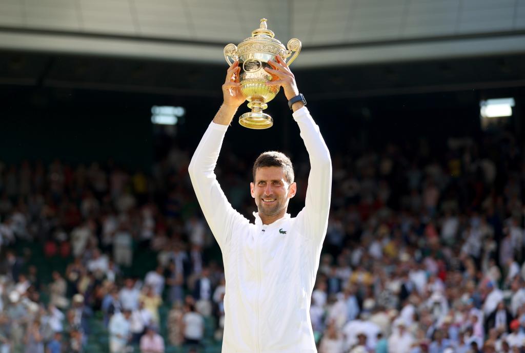 在2022温布尔登网球公开赛上,焦科维奇高举男子单打冠军奖杯庆祝。新华社记者 李颖 摄