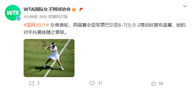 北京时间6月30日,2025温网女单首轮,两届赛会亚军贾巴尔在6-7(5) 0-2落后时宣布退赛,她的对手托莫娃随之晋级。