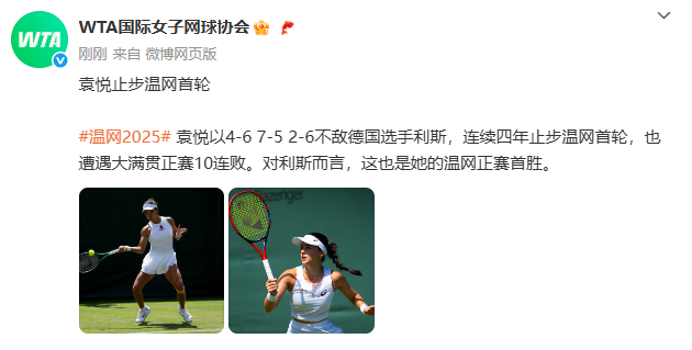 北京时间6月30日晚,袁悦以4-6 7-5 2-6不敌德国选手利斯,连续四年止步温网首轮,也遭遇大满贯正赛10连败。对利斯而言,这也是她的温网正赛首胜。