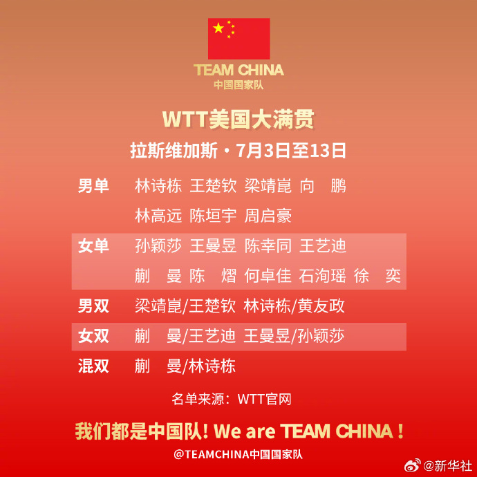 2025年WTT美国大满贯将于7月3日至13日在拉斯维加斯举行。林诗栋、王楚钦等出战男单,孙颖莎、王曼昱、陈幸同等出战女单,梁靖崑/王楚钦等出战男双,蒯曼/王艺迪等出战女双,蒯曼/林诗栋出战混双,详戳↓一起为国乒加油!