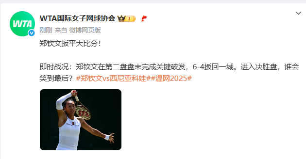 即时战况:郑钦文在第二盘盘末完成关键破发,6-4扳回一城。进入决胜盘,谁会笑到最后?