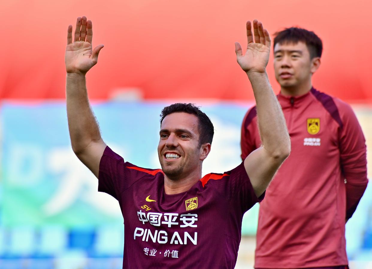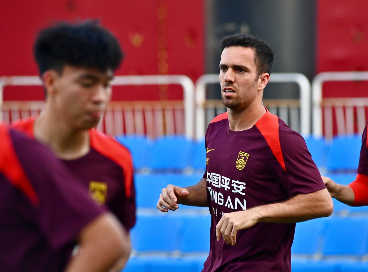 7月2日,中国队球员塞尔吉尼奥(右)在训练中。新华社记者 吴青昊 摄