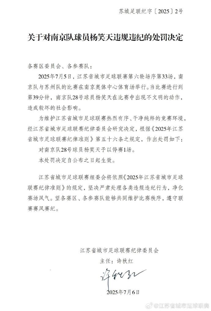 7月6日,@江苏省城市足球联赛 发布《关于对南京队球员杨笑天违规违纪的处罚决定》,内容如下: