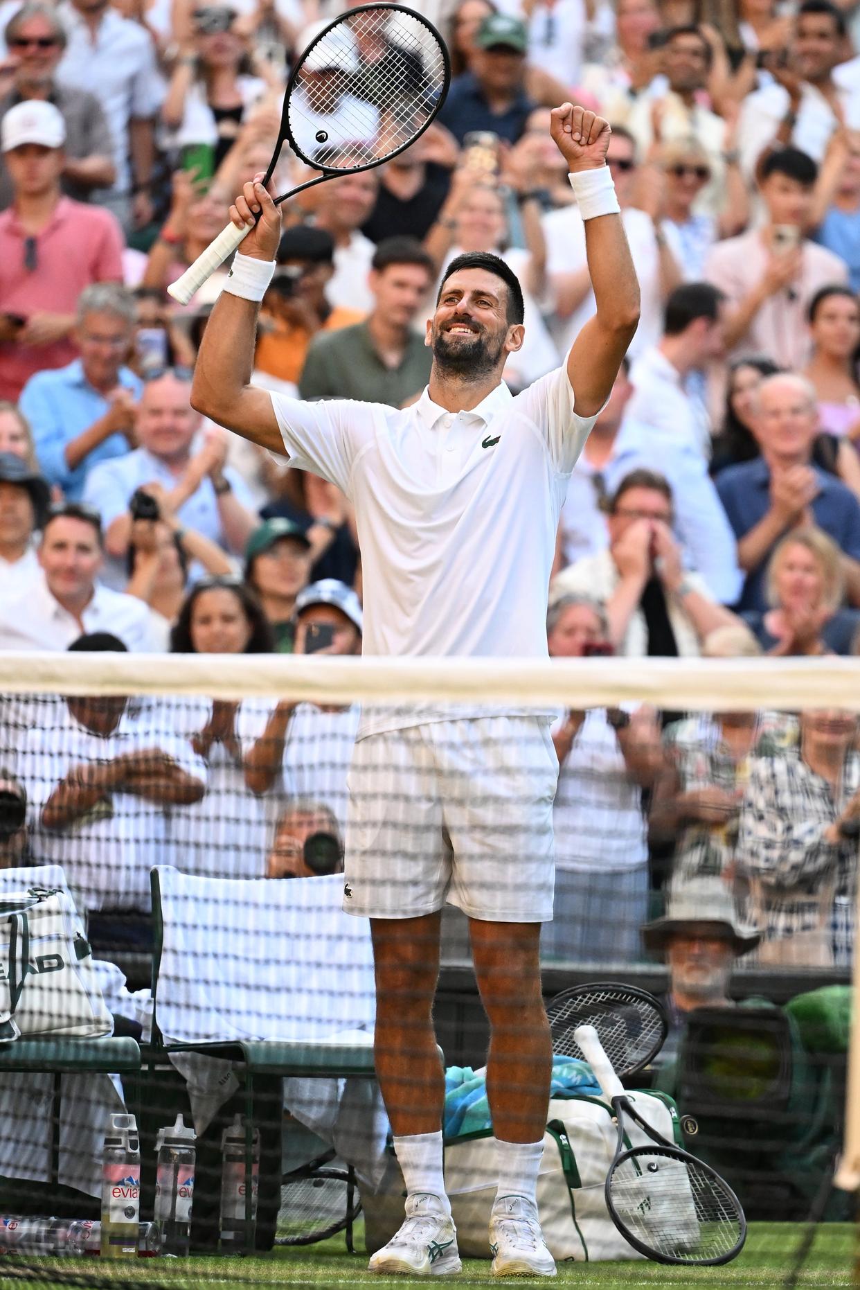 7月9日,德约科维奇在比赛后庆祝。新华社记者 赵丁喆 摄