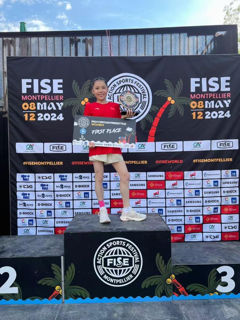 商春松在2024年跑酷世界杯蒙彼利埃站比赛中登上冠军领奖台。