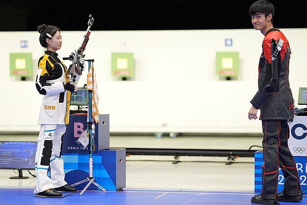 2024年巴黎奥运会首个比赛日,在射击10米气步枪混合团体比赛中,中国选手黄雨婷(左)/盛李豪获得金牌。