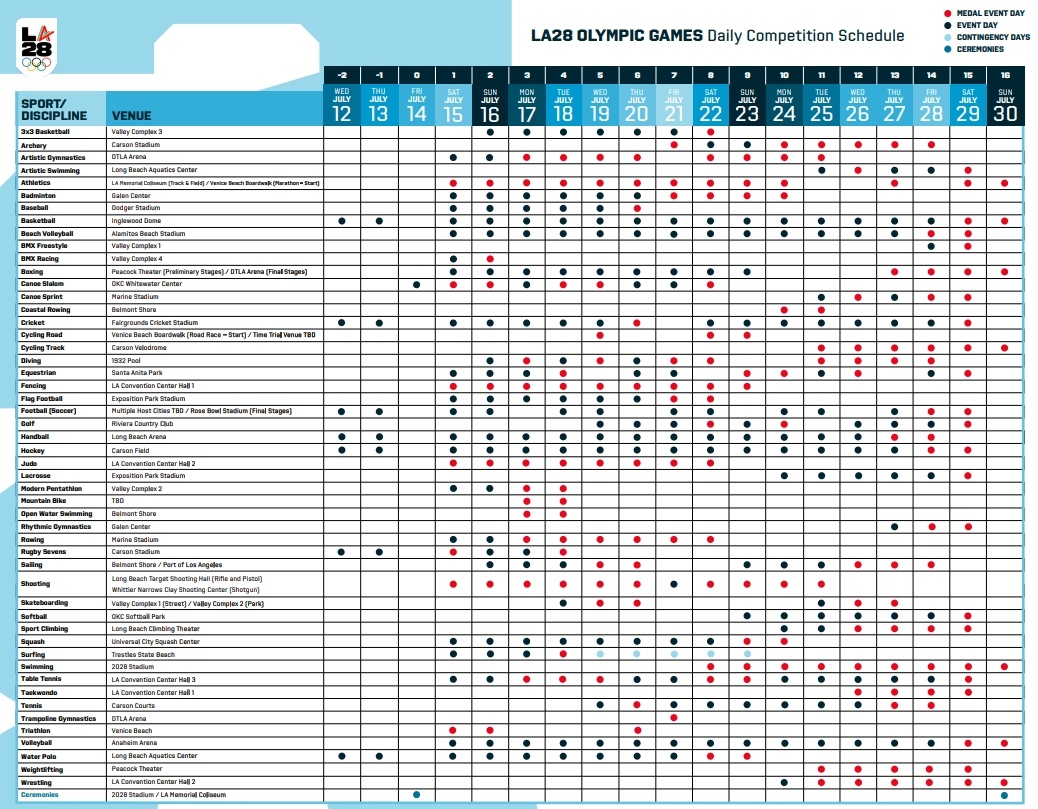 开幕式将于2028年7月14日举行,闭幕式安排在7月30日。从7月12日开始,就会有提前进行的比赛。