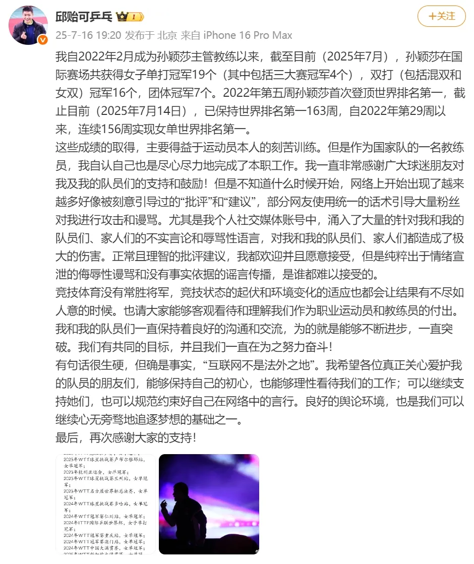 16日晚,中国乒乓球队教练员、孙颖莎主管教练邱贻可发长文回应近期争议,并晒出孙颖莎近年乒乓比赛战绩。